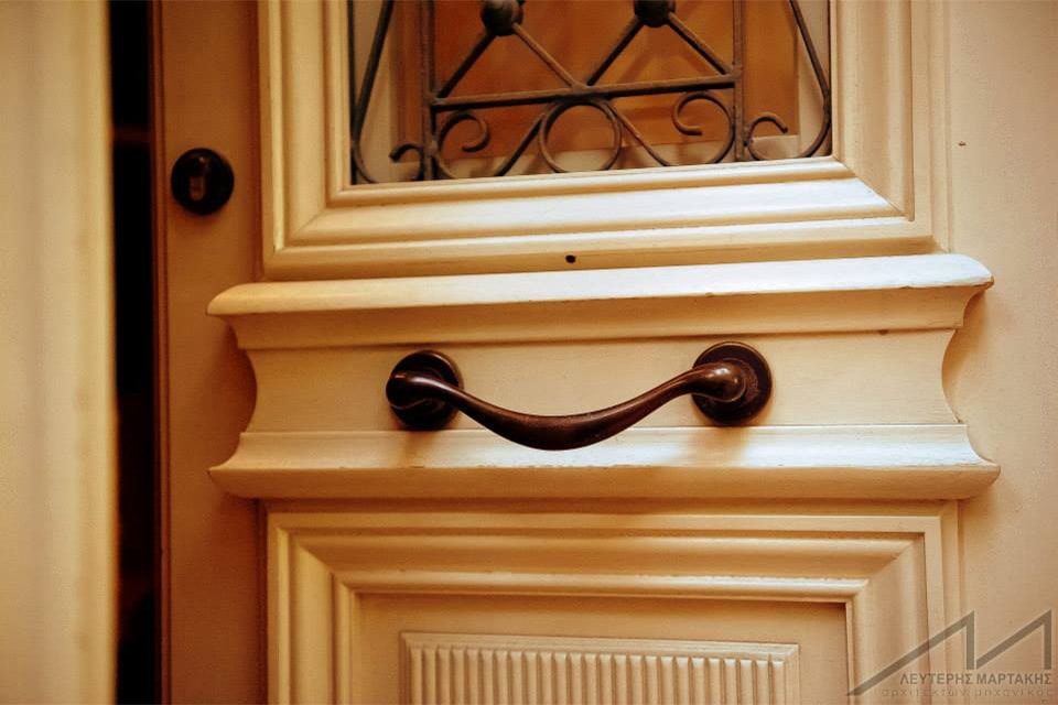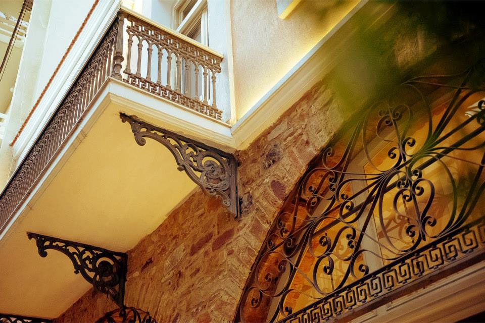 The main façade has been restored as it goes: all the wooden openings are repaired and repainted, part of the ground floor walls which are constructed mainly of large grey stones (of Turkish origin) are reconditioned. These particular walls support the arches of the ground floor. The solid iron parts of corbels and railings of the unique balcony as well as the decorative iron railings of the openings are restored and preserved with a special technique. The highlight of the exterior main façade restoration is the architectural lighting which emphasizes the verticality of the building with the use of fitted light spots as well as exterior light spots with a narrow light beam.