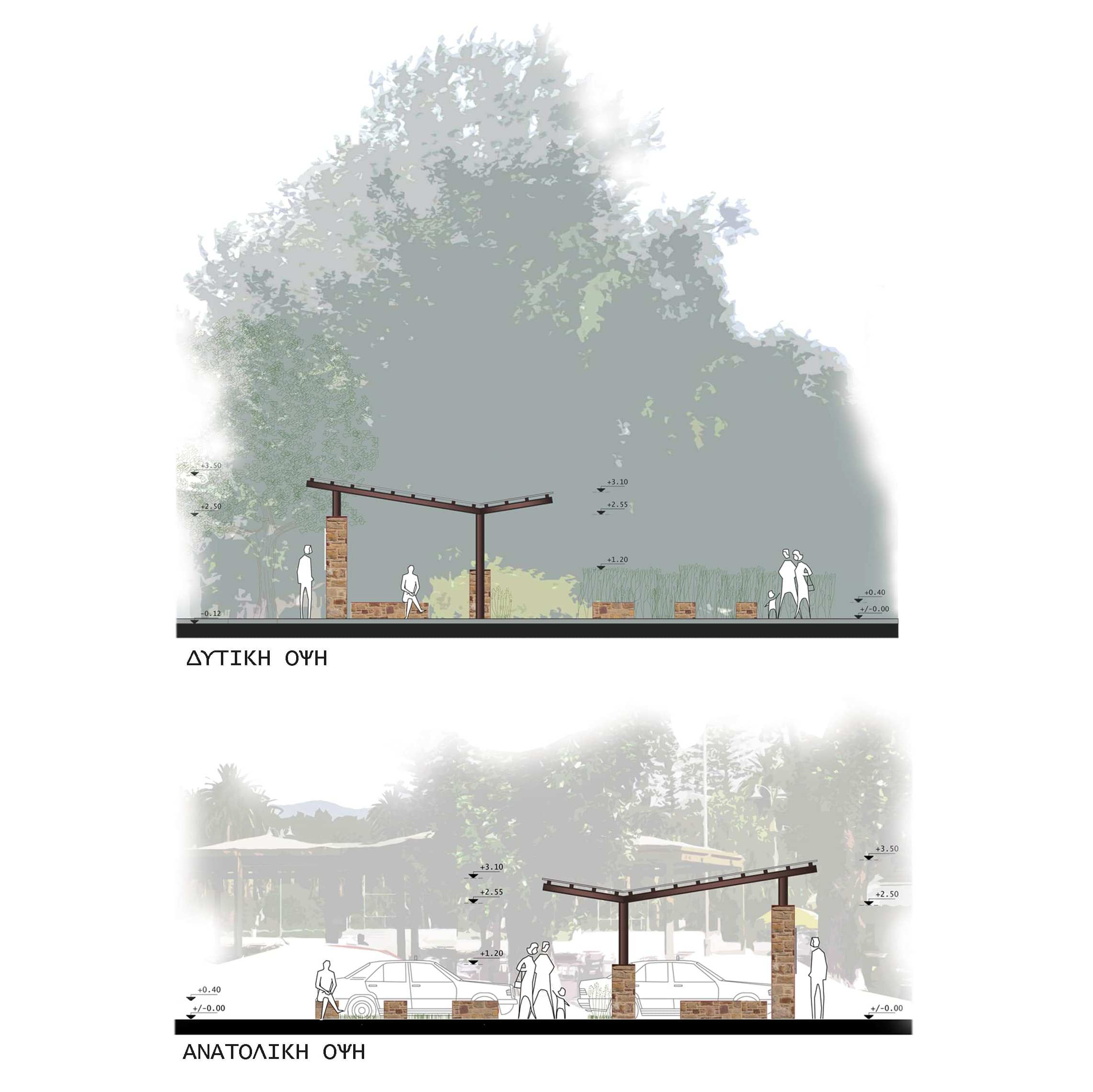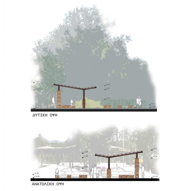 Χώροι καθιστικού βρίσκονται εντός και εκτός του χώρου αναμονής και κατασκευάζονται από θυμιανούσικη πέτρα, με σταθερό ύψος (0,40εκ.). Μέρος του σχεδιασμού αποτελεί η δημιουργία χώρων φύτευσης, οι οποίοι ακολουθούν την χάραξη των υπαίθριων καθιστικών και οριοθετούν τον άξονα κίνησης προς τον χώρο αναμονής επιβατών.
