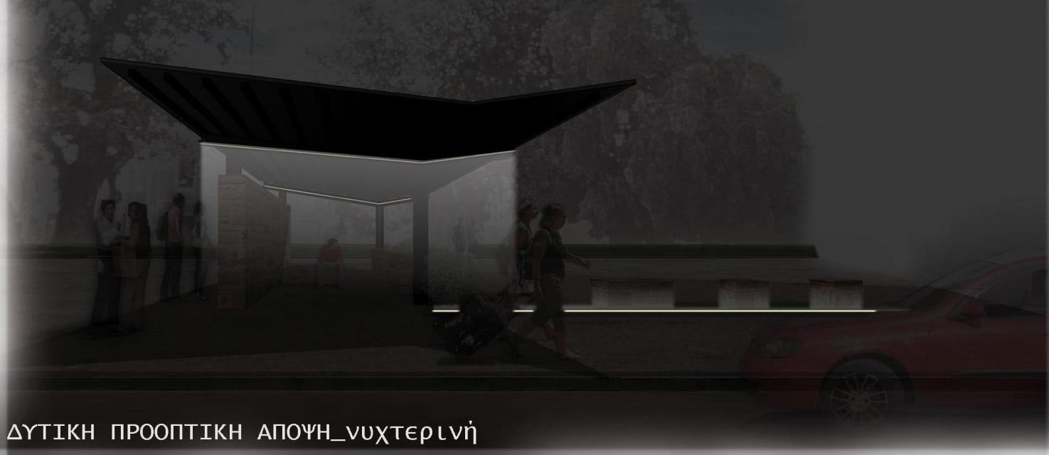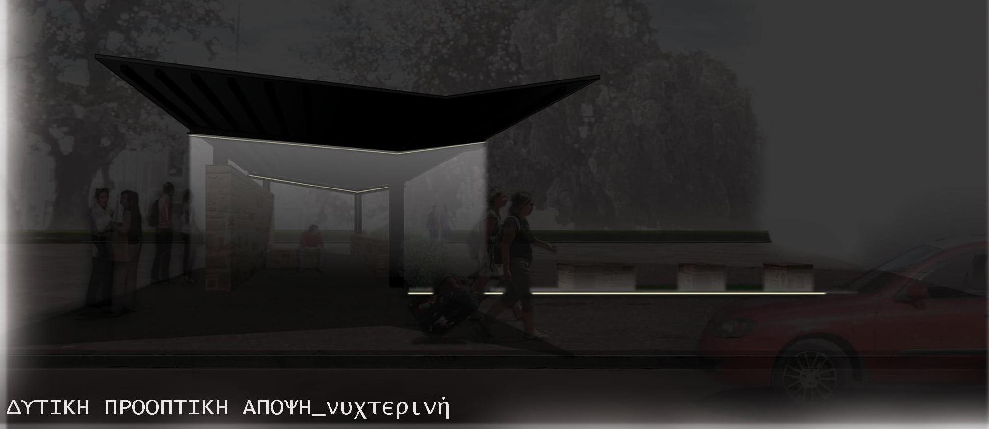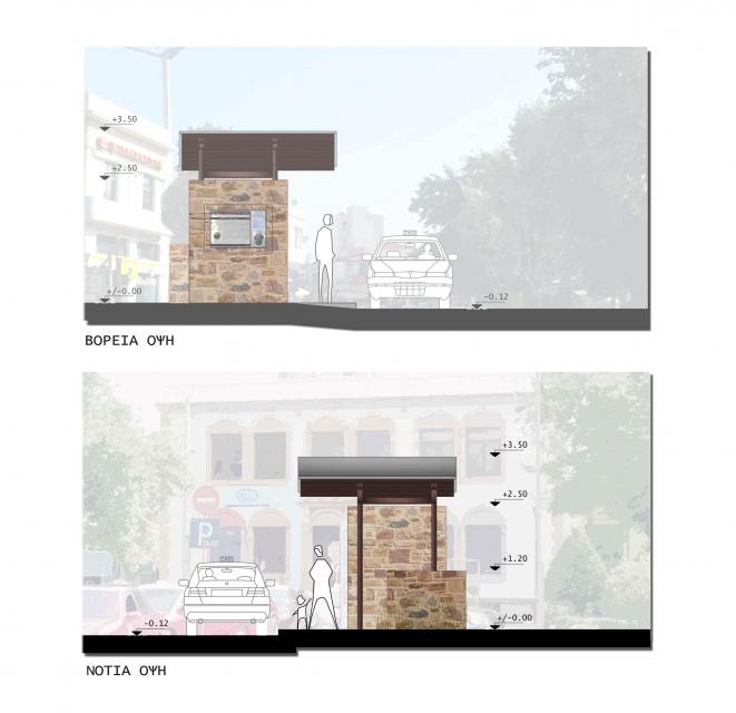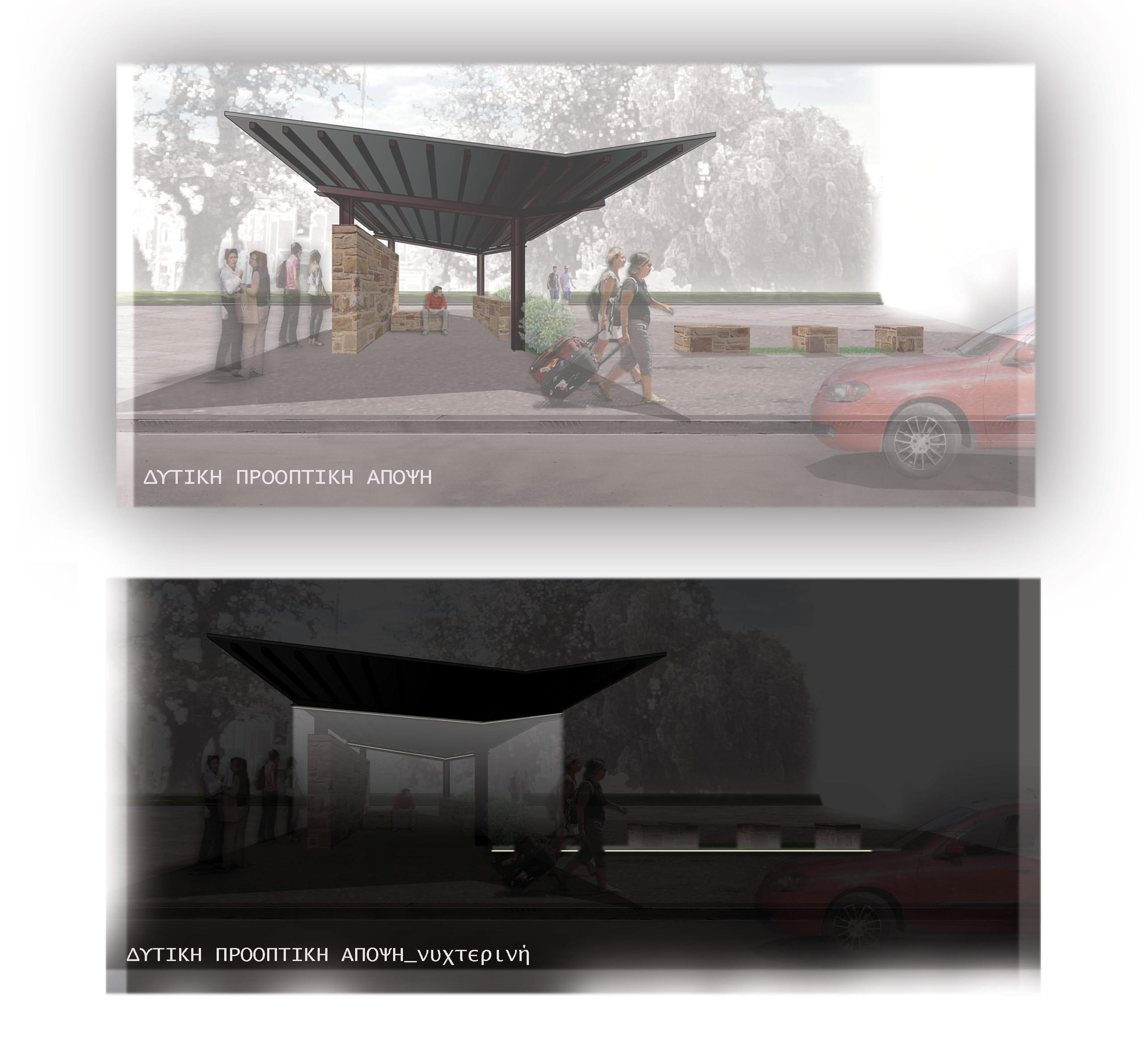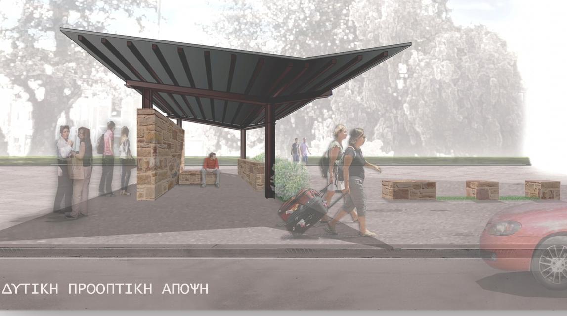 Πρωταρχικός στόχος του σχεδιασμού είναι η δημιουργία ενός νέου τοπόσημου στην περιοχή, εύκολα αναγνωρίσιμου, τόσο από τους μόνιμους κατοίκους του νησιού όσο και από τους επισκέπτες του. Η λύση τοποθετείται στη στάθμη του υφιστάμενου πεζοδρομίου (υψομετρική διαφορά 0,12εκ. σε σχέση με τη στάθμη του δρόμου) και η πρόσβαση σε αυτήν γίνεται είτε μέσω του ρείθρου είτε μέσω προτεινόμενης ράμπας κλίσης 5%, στη βόρεια πλευρά του χώρου αναμονής. Η πρόταση αποτελεί μια ημιυπαίθρια στέγαση και ταυτόχρονα μια «ανοικτή» αγκαλιά για όλους, στην οποία μεταβαίνει κανείς σταδιακά, μέσω ενός άξονα κίνησης Νότου → Βορρά πλάτους 1,40 μέτρων, καταλήγοντας στον στεγασμένο χώρο αναμονής. Ένας δεύτερος άξονας κίνησης, διπλής κατεύθυνσης, αναπτύσσεται παράλληλα και πίσω από τον στεγασμένο χώρο, διατηρώντας την υπάρχουσα διέλευση των πεζών.