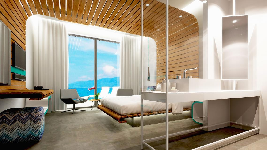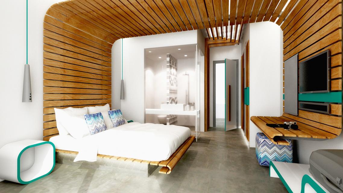 Βασικό στοιχείο της σύνθεσης αποτελεί η μορφή της αναδίπλωσης (folding), η οποία κυριαρχεί στον χώρο και εκφράζεται με την κατασκευή του κρεβατιού–γραφείου στο κέντρο του δωματίου. Η κατασκευή αποτελείται από μεταλλικό σκελετό επενδυμένο με ξύλινες σανίδες και εδράζεται σε βάση, με κρυφό φωτισμό, η οποία υποχωρεί με στόχο να δίνεται η αίσθηση της αιώρησης του κρεβατιού. Το στοιχείο της καμπύλης, που υπάρχει στην κατασκευή επαναλαμβάνεται και σε άλλα στοιχεία του δωματίου όπως στα κομοδίνα, στον πάγκο αποσκευών και στο κάθισμα γραφέιου, δίνοντας την συνολική αίσθηση της αγκαλιάς και της φιλοξενίας στον χρήστη.