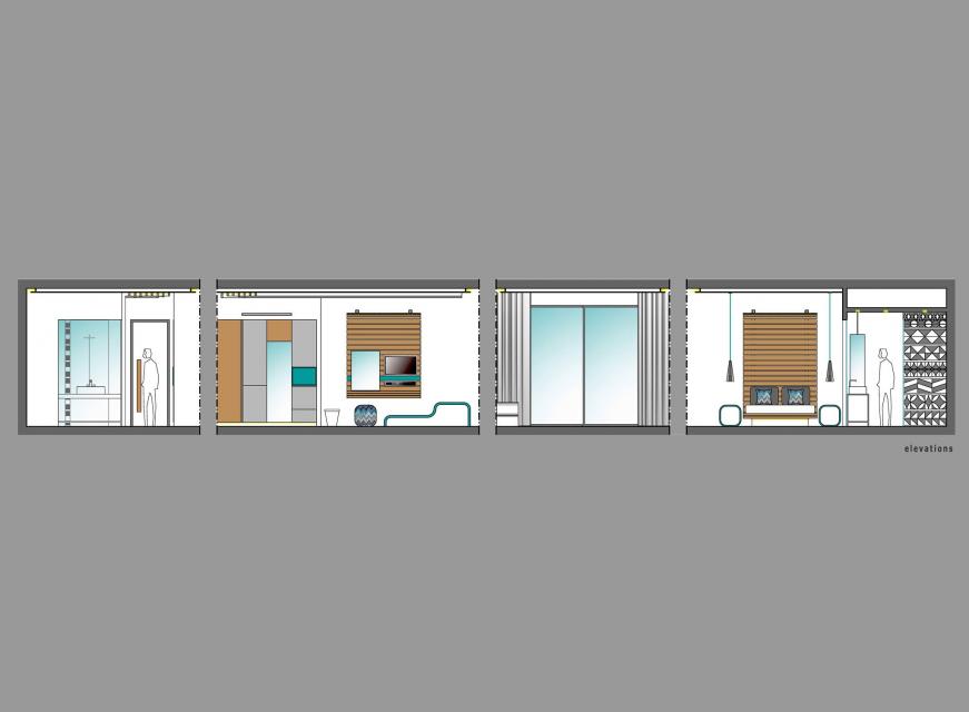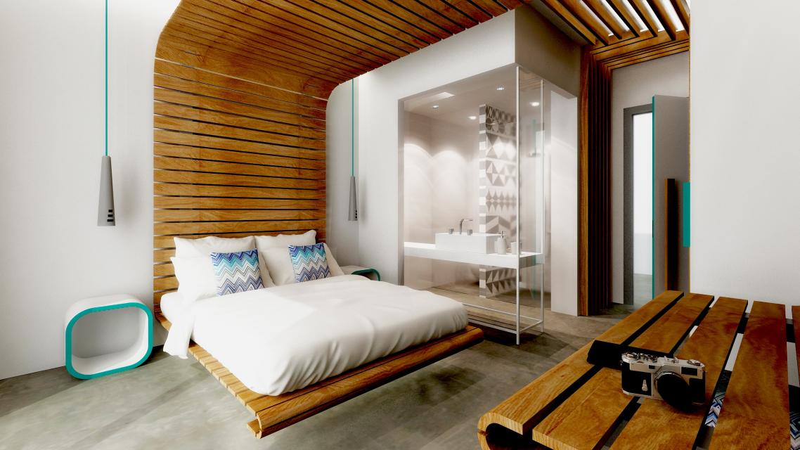 Η μελέτη αφορά τον σχεδιασμό του εσωτερικού χώρου ενός δωματίου ξενοδοχείου τεσσάρων αστέρων. Κάνοντας την παραδοχή ότι το ξενοδοχείο βρίσκεται στο Ανατολικό Αιγαίο και συγκεκριμένα στην πόλη της Χίου, στόχος της σύνθεσης αποτελεί η δημιουργία ενός χώρου χαλάρωσης με ενοποιημένη και λειτουργική κάτοψη. Αυτό επιτυγχάνονται με την χρήση φυσικών υλικών, όπως ξύλο και πατητή τσιμεντοκονία, γήινων χρωμάτων καθώς και με την χρήση υαλοπετασμάτων ως διαχωριστικά στοιχεία. Διακριτική, αλλά αισθητή η λεπτομέρεια του γαλαζοπράσινου χρώματος των ελληνικών θαλασσών που επιλέγεται για την έμφαση υλικών, επίπλων και λεπτομερειών στις ξύλινες κατασκευές. Τέλος, έμπνευση αποτέλεσε το χαρακτηριστικό αρχιτεκτονικό μοτίβο των "ξυστών", το οποίο απεικονίστηκε με την χρήση κεραμικών πλακιδίων σε τοιχοποιίες του λουτρού.