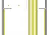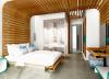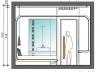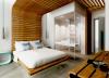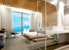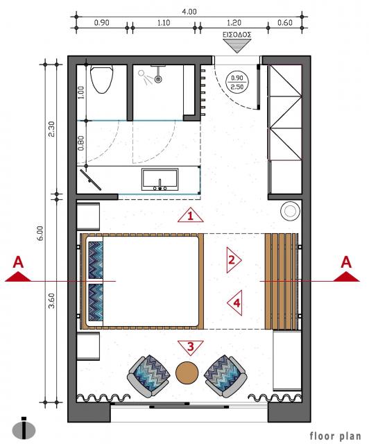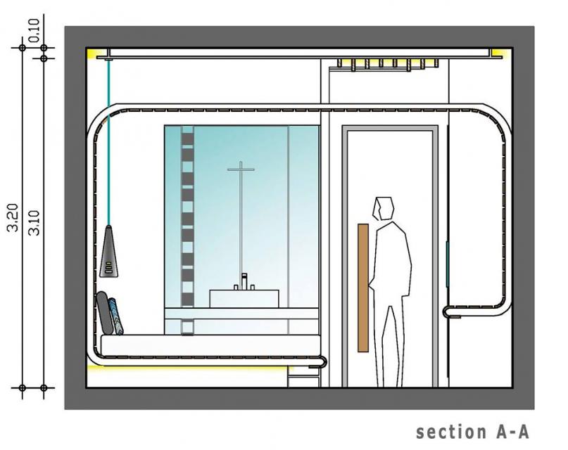 Η πρόσβαση στο δωμάτιο γίνεται μέσω θύρας που οδηγεί σε ευρύχωρο διάδρομο με ντουλάπα αποθήκευσης ρούχων και ολόσωμο καθρέφτη στα αριστερά. Στην ντουλάπα εντοιχίζονται χρηματοκιβώτιο, μικρό ψυγείο και υπάρχει εσοχή με χώρο παρασκευής καφέ. Η πορεία κίνησης στο δωμάτιο ορίζεται διακριτά και από την οροφή, με κατασκευή από ξύλινες παράλληλες σανίδες οι οποίες ξεκινούν από τον τοίχο δίπλα στη θύρα εισόδου, συνεχίζουν στην οροφή και διατρέχουν το δωμάτιο σε όλο το μήκος του.Στα δεξιά βρίσκεται το λουτρό αποτελούμενο από τον προθάλαμο με το νιπτήρα, το χώρο του ντουζ και της λεκάνης. Η πρόσβαση στον προθάλαμο γίνεται εν συνεχεία του βασικού άξονα κίνησης, διαμορφώνοντας μια ελεύθερη και ενιαία κάτοψη. Οι χώροι του ντουζ και της λεκάνης διαχωρίζονται με τοίχο που επενδύεται με πλακίδια τα οποία απεικονίζουν το χαρακτηριστικό μοτίβο του «ξυστού», ενώ απομονώνονται με γυάλινες αμμοβολημένες θύρες. Με την χρήση υαλοπετασμάτων επιτυγχάνεται αφενός η ενότητα και η οπτική επαφή του λουτρού με το δωμάτιο, αφετέρου η δυνατότητα απομόνωσης του, μέσω ειδικού συστήματος θόλωσης των υαλοπετασμάτων.