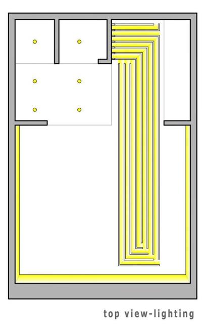 Ιδιαίτερη έμφαση δίνεται στον τεχνητό φωτισμό του δωματίου ο οποίος πραγματοποιείται με τη χρήση ταινιών led και χωνευτών σποτ. Κύρια πηγή φωτισμού του δωματίου αποτελεί ο περιμετρικός κρυφός φωτισμός με ταινία led, η οποία τοποθετείται σε υποχώρηση της ψευδοροφής στις τρεις πλευρές του δωματίου. Επιπλέον φωτισμός υπάρχει και στην επιμήκη κατασκευή παράλληλων ξύλινων σανίδων η οποία διατρέχει όλο το μήκος του δωματίου. Το χρώμα φωτός που επιλέγεται είναι 3.000 kelvin ενώ η φωτεινότητα (14,4 watt) μπορεί να ρυθμιστεί με χρήση ροοστάτη, μέσω της κεντρικής κονσόλας ελέγχου ήχου και εικόνας του δωματίου. Χρήση χωνευτών σποτ στενής δέσμης είναι η επιλογή για τον φωτισμό του λουτρού.