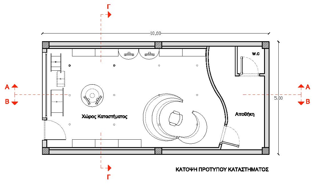Η μορφή της κατασκευής βιτρίνας, δίνει την αίσθηση της αιώρησης στον χώρο και λόγω της χρήσης υλικών όπως το plexiglass δεν παρεμποδίζεται η οπτική επαφή προς το εσωτερικό ή το εξωτερικό του καταστήματος.