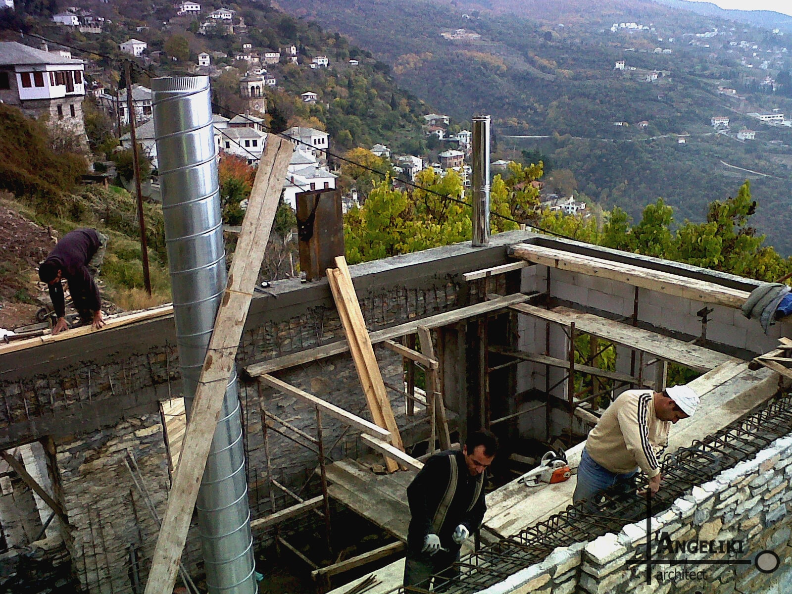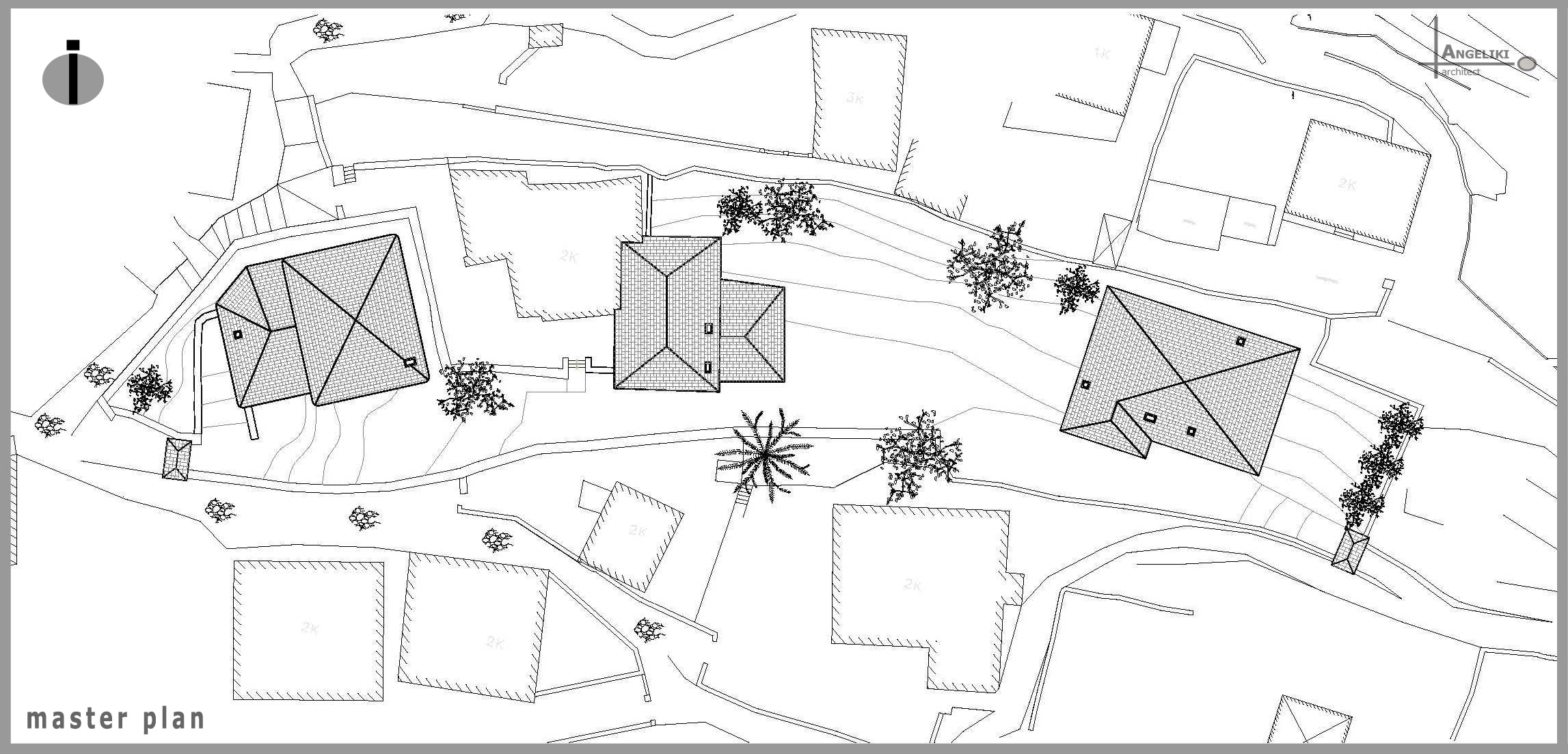 Όλα τα οικόπεδα προϋπήρχαν του 1980 και στο μεσαίο οικόπεδο υπήρχε παλαιό πέτρινο κτίσμα, χρόνια ερειπωμένο και κατεστραμμένο σε μεγάλο βαθμό. Η μελέτη αφορούσε αρχικά την αναπαλαίωση του παλαιού ερειπωμένου κτίσματος, την ανέγερση δύο νέων διώροφων κατοικιών με υπόγεια, και την ενοποίηση των τριών οικοπέδων σε έναν ενιαίο διαμορφωμένο περιβάλλοντα χώρο.Ο αρχιτεκτονικός σχεδιασμός βασίστηκε στην παραδοσιακή αρχιτεκτονική της περιοχής με απόλυτο σεβασμό στα τοπικά χαρακτηριστικά του Πηλίου και η κατασκευή έγινε με τοπικά υλικά και συνεργεία.