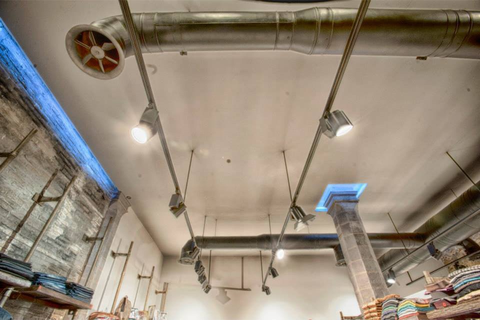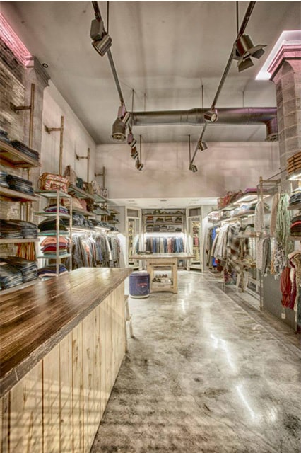 Το κατάστημα τοποθετείται στο ισόγειο του κτιρίου. Ο ενιαίος χώρος του ισογείου καταστήματος χωρίζεται σε δύο ίσα τμήματα διαχωρίζοντας την ένδυση ανδρών και γυναικών με ξεχωριστά δοκιμαστήρια σε κάθε ενότητα. Ο χαρακτήρας που του δόθηκε είναι ο βιομηχανικός, ενσωματώνοντας συγχρόνως στοιχεία από το παλιό κατάστημα, όπως για παράδειγμα τα ξύλινα βάθρα των βιτρινών καθώς και οι ξύλινοι πάγκοι εξυπηρέτησης και ταμείου. Η ψύξη-θέρμανση καθώς και ο φωτισμός του χώρου αναρτώνται από την οροφή και βάφονται μαύρα. Στο δάπεδο εφαρμόζεται πατητή τσιμεντοκονία γκρι χρώματος.
