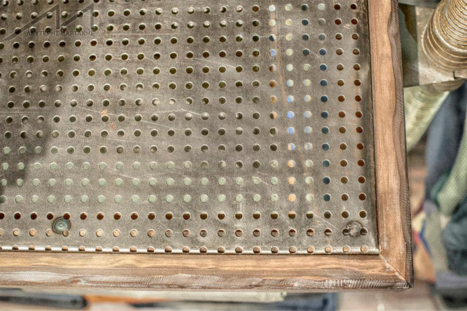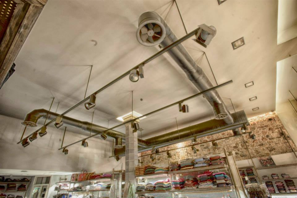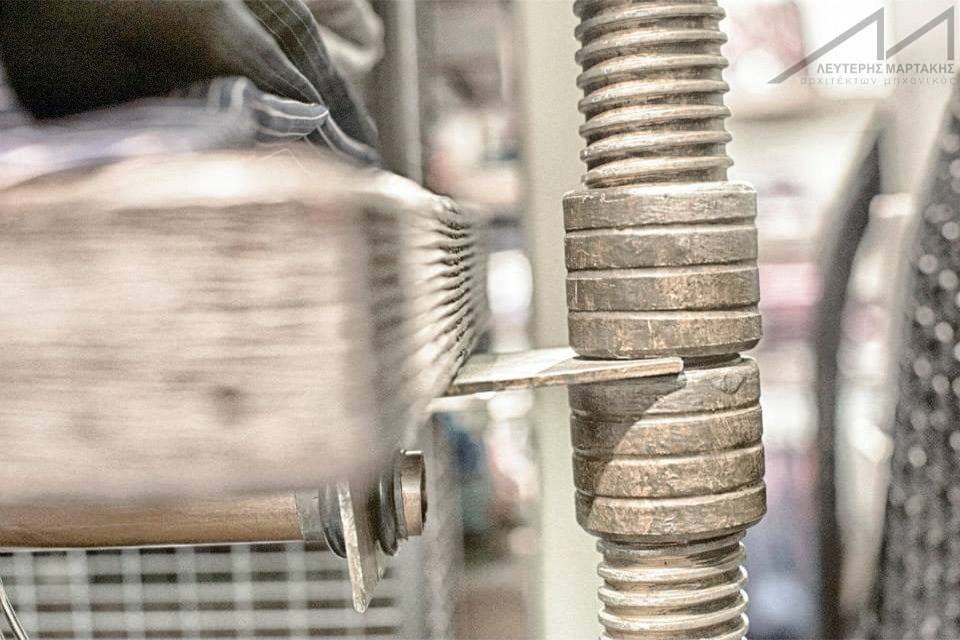 Αυτό που κάνει όμως ξεχωριστό το κατάστημα είναι το χειροποίητο, σιδερένιο σύστημα ραφιών το οποίο μετατρέπεται ανάλογα με τις εκάστοτε ανάγκες των προϊόντων του καταστήματος. Μεταλλικοί ορθοστάτες τοποθετημένοι ανά συγκεκριμένη απόσταση φέρουν τα ράφια, τα οποία μπορούν να μετακινηθούν κατακόρυφα, λόγω της μορφής τους ως σπείρες. Τα ράφια αποτελούνται από ξύλινο, παλαιωμένο πλαίσιο, ενώ το μεσαίο τμήμα τους καλύπτεται είτε από τζάμι, είτε από διάτρητη μαύρη λαμαρίνα. Ειδικές κατασκευές με πλαίσια από σιδηρούν οπλισμό και συρματόπλεγμα, πακτωμένα σε κάθετους ορθογωνικής διατομής κοιλοδοκούς, διαχωρίζουν τις δύο ενότητες, επιτρέποντας σε κάποιον να μπορεί να δει τι γίνεται δίπλα, ενώ συγχρόνως οι κατασκευές αυτές λειτουργούν ως προβολή προϊόντων.