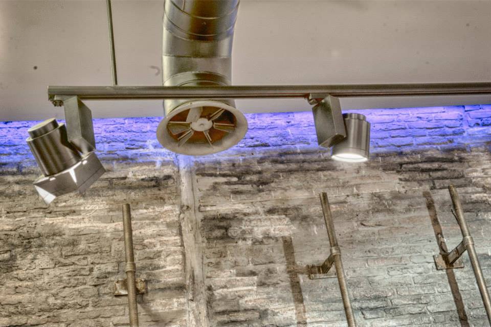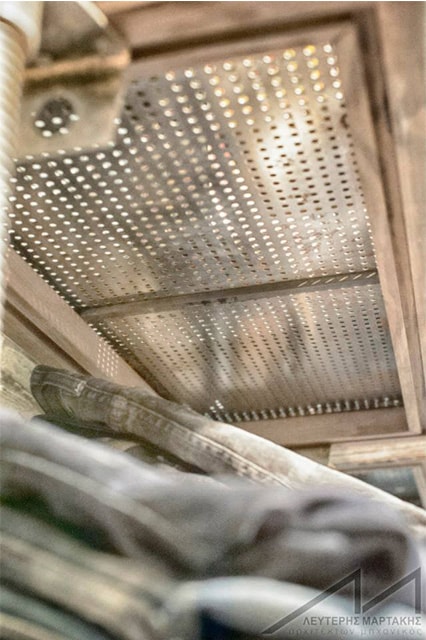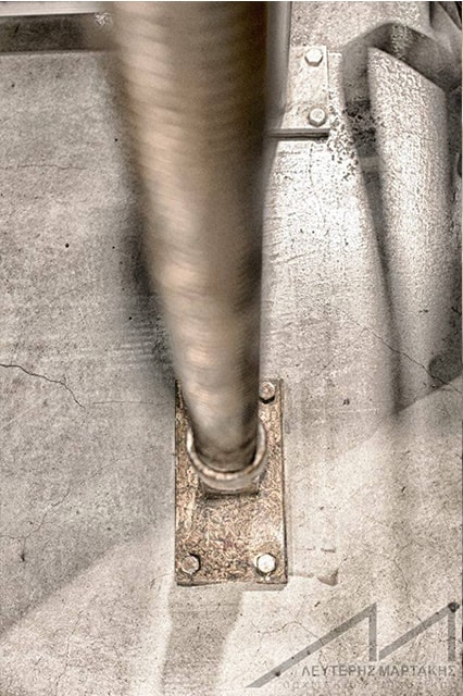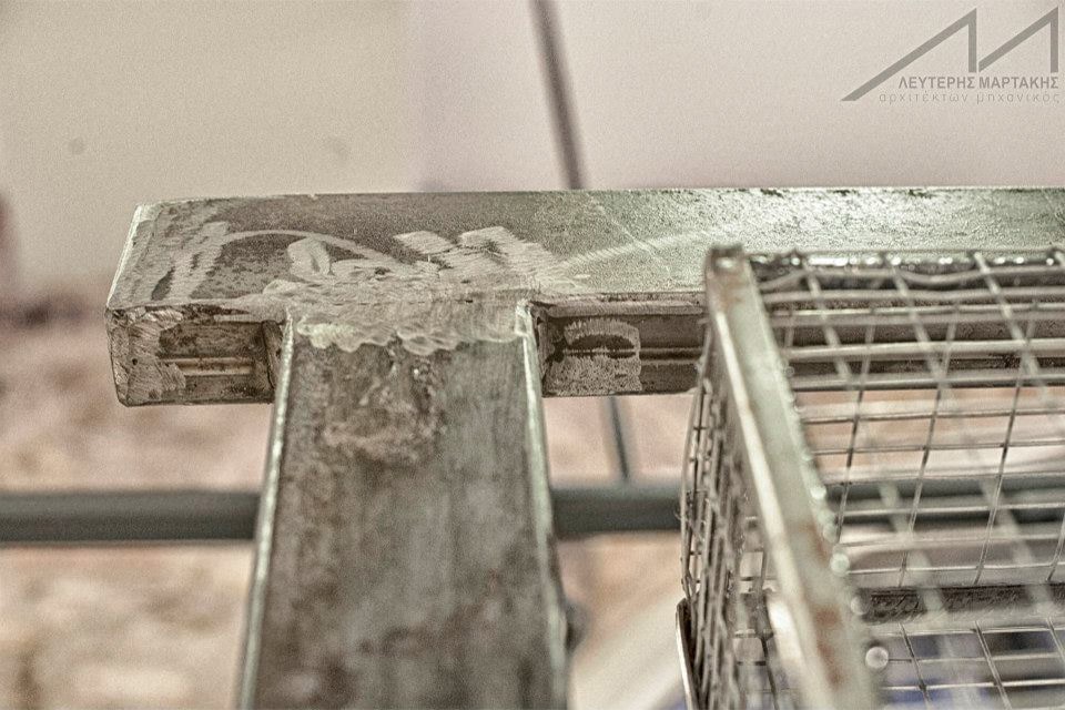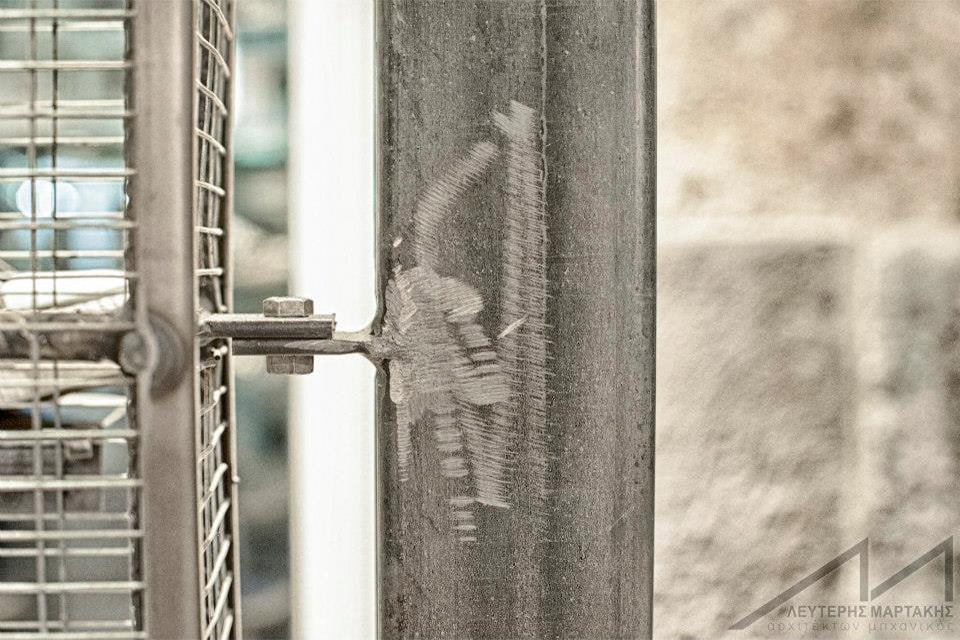 Όλοι οι ορθοστάτες καθώς και οι βάσεις αγκύρωσής τους σε δάπεδο και τοίχους είναι πατιναρισμένοι ενώ οι υπόλοιπες μεταλλικές κατασκευές έχουν περαστεί ένα απλό διάφανο βερνίκι αναδεικνύοντας το ίδιο το υλικό καθώς και την επεξεργασία του για την ολοκλήρωση της κατασκευής.