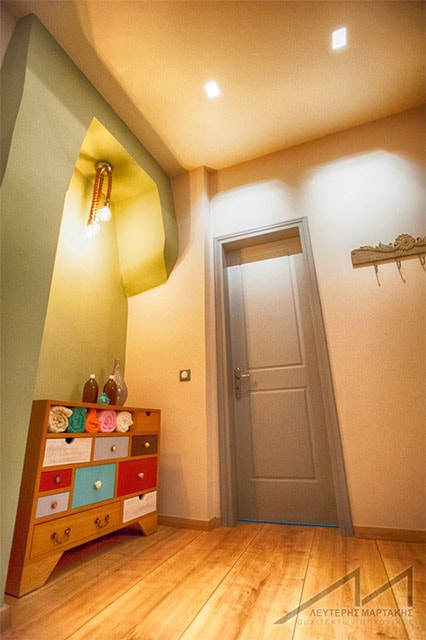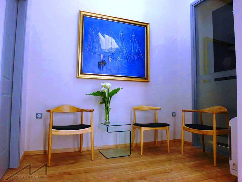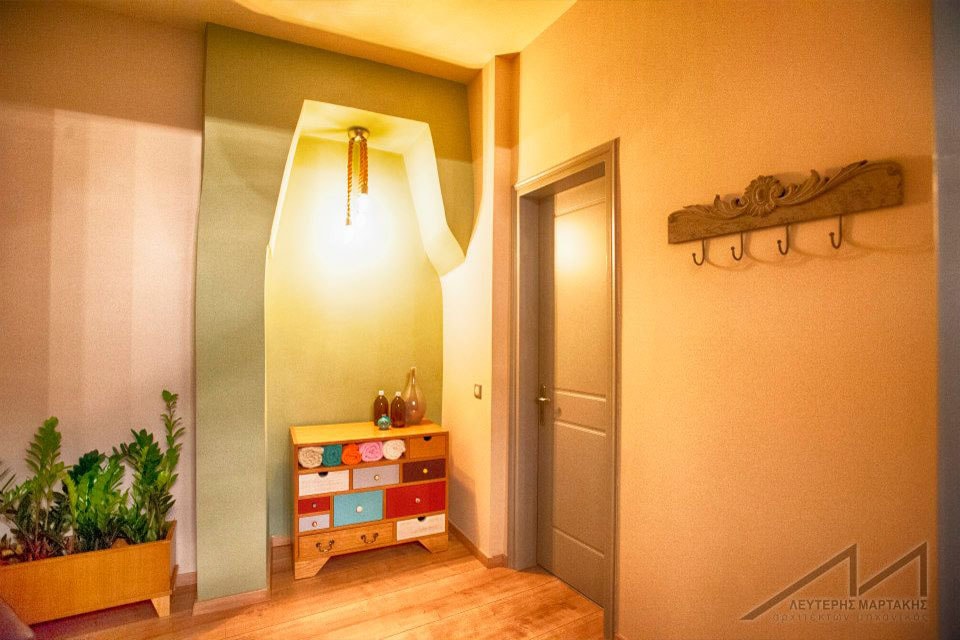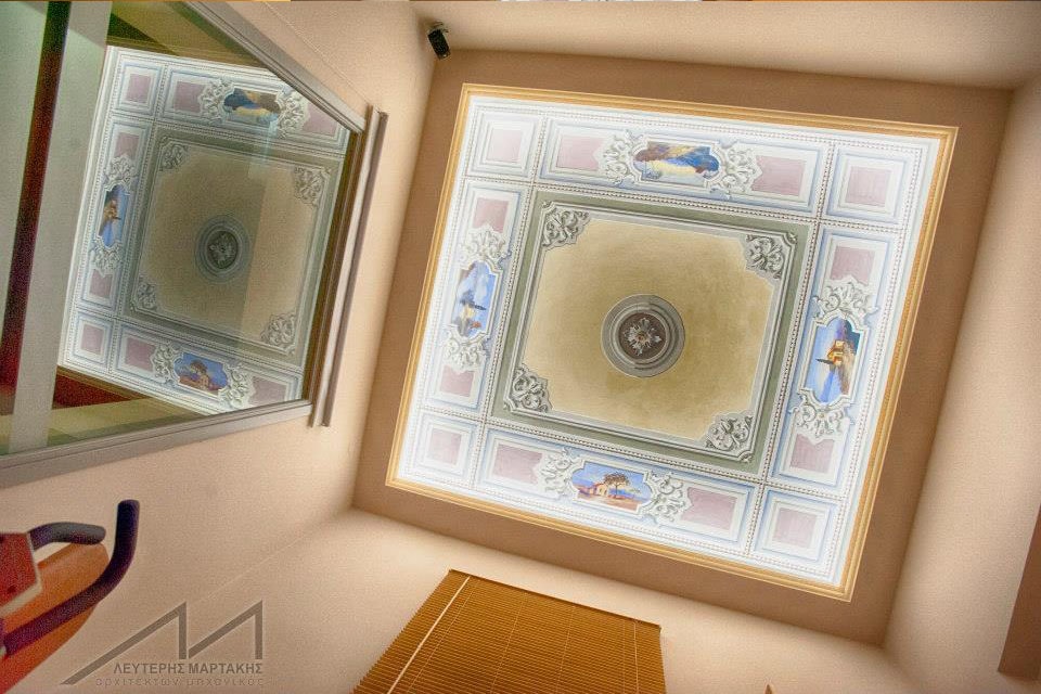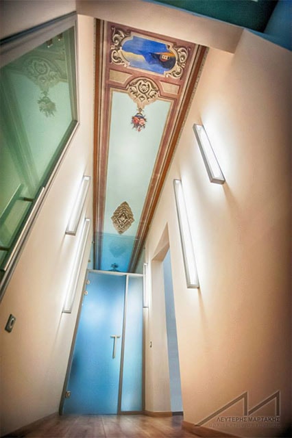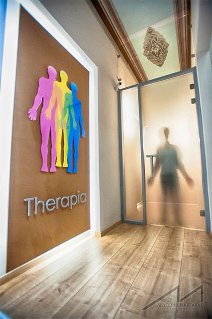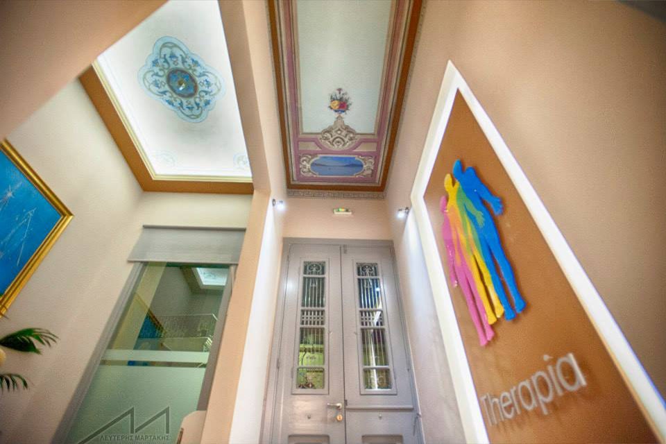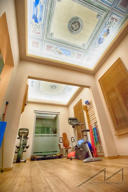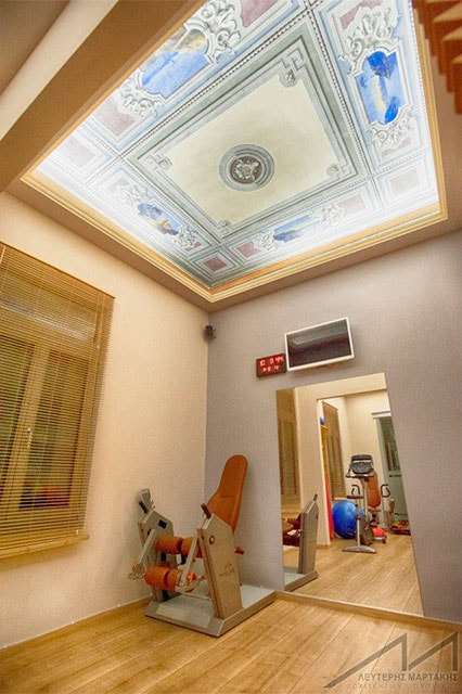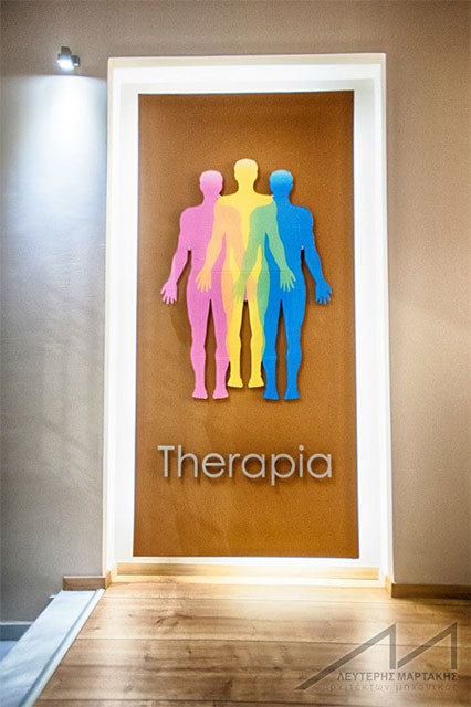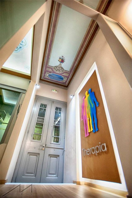 Τα παλαιά κτίσματα έχουν ήδη τον δικό τους ιδιαίτερο χαρακτήρα, τόσο εξωτερικά όσο και στο εσωτερικό τους. Με το συγκεκριμένο έργο πραγματοποιήθηκε ένα ιδιαίτερο «πάντρεμα» των παλαιών στοιχείων ενός χώρου με σύγχρονα και μοντέρνα. Ιδιαίτερη έμφαση δόθηκε στην ανάδειξη των υπέροχων συντηρημένων οροφογραφιών που υπήρχαν, με κρυφό και διακριτικό φωτισμό καθώς και κατασκευών γυψοσανίδας με ιδιαίτερα τελειώματα που τις κάνουν να ξεχωρίζουν ακόμη περισσότερο. Οι ένοικοι του χώρου, δύο νέοι και πολλά υποσχόμενοι φυσικοθεραπευτές, ήθελαν ο χώρος εργασίας τους να είναι μοναδικός και άνετος, τόσο για τους ίδιους, όσο και για τους ασθενείς τους. Έτσι, έγινε σχεδιασμός όλων των επίπλων του γραφείου τους καθώς και των χώρων θεραπειών τους. Ιδιαίτερη σημασία τέλος στην μελέτη του χώρου δόθηκε στον διάδρομο και τον φωτισμό του, που αποτελεί τον κύριο άξονα κίνησης του φυσικοθεραπευτηρίου και ενώνει τον χώρο αναμονής με το γυμναστήριο, το γραφείο και τις αίθουσες θεραπειών.