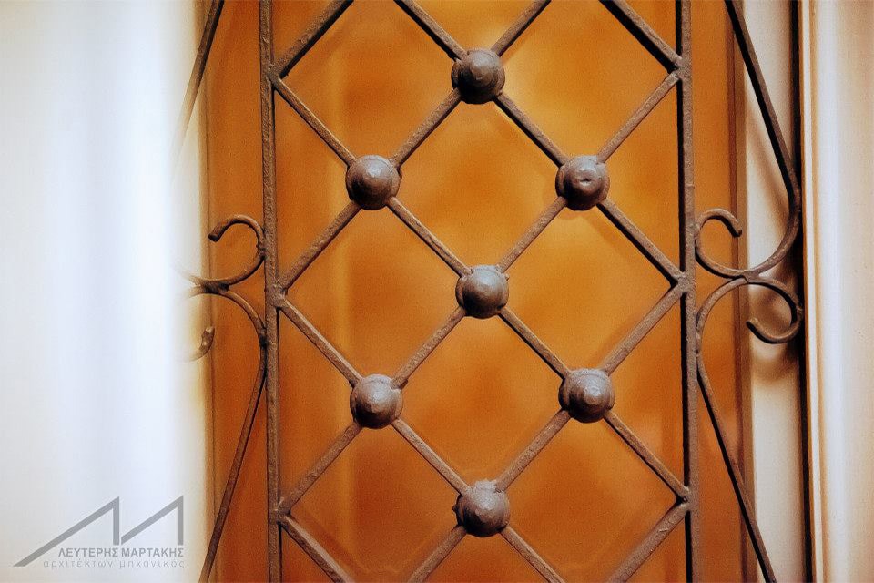 The main façade has been restored as it goes: all the wooden openings are repaired and repainted, part of the ground floor walls which are constructed mainly of large grey stones (of Turkish origin) are reconditioned. These particular walls support the arches of the ground floor. The solid iron parts of corbels and railings of the unique balcony as well as the decorative iron railings of the openings are restored and preserved with a special technique. The highlight of the exterior main façade restoration is the architectural lighting which emphasizes the verticality of the building with the use of fitted light spots as well as exterior light spots with a narrow light beam.